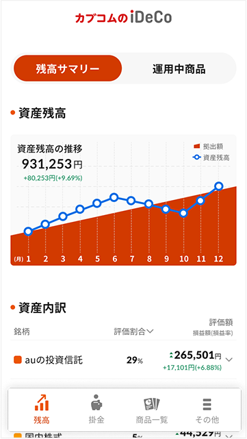 資産残高の推移・資産内訳毎の評価額/損益・掛金拠出額が確認可能