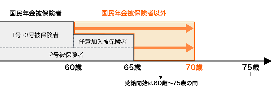 - 施行日までに老齢基礎年金やiDeCoの老齢給付金を受給した方は加入不可