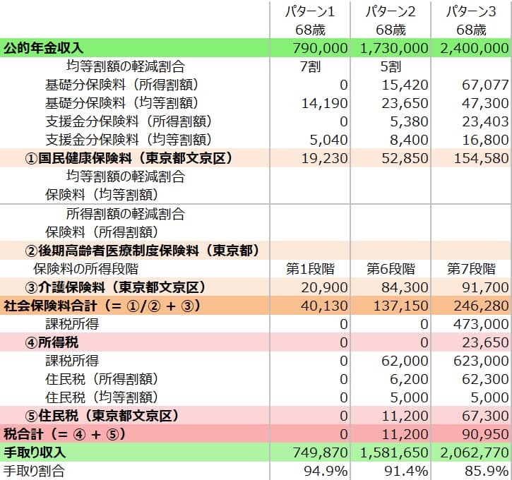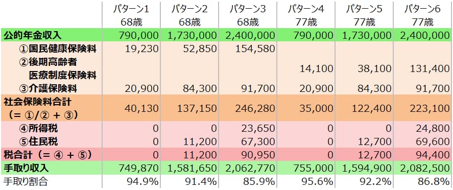 最初に結果をお伝えすると、68歳で年金収入が79万円(パターン1)なら手取り額は約75万円、173万円(パターン2)なら約158万円、240万円(パターン3)なら約206万円となり、年金収入に対する手取り額の割合はそれぞれ94.9%、91.4%、85.9%となります。