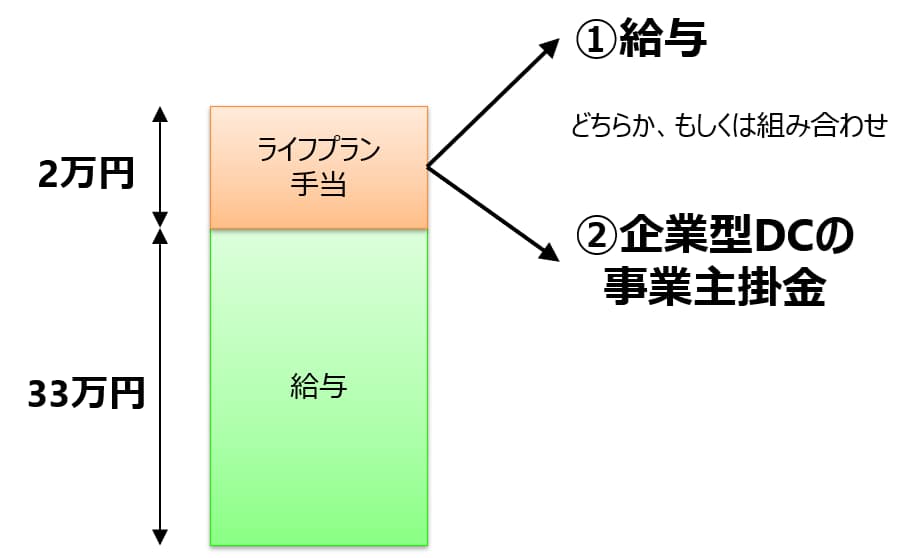ここでは具体的に、もともと給与として月額35万円を受け取っていた人が、選択制DC導入により、給与33万円、ライフプラン手当2万円となった場合で具体的に考えてみます。なお、ここでは簡単のため賞与はないものと仮定します。