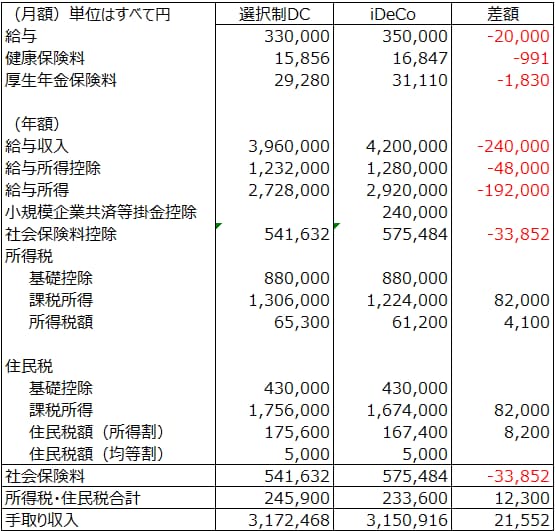 年間24万円(月額2万円)の掛金相当について、給与収入がそもそもなかったとして計算される選択制DCと、小規模企業共済等掛金控除の所得控除として計算されるiDeCoという特徴が出ているかと思います。