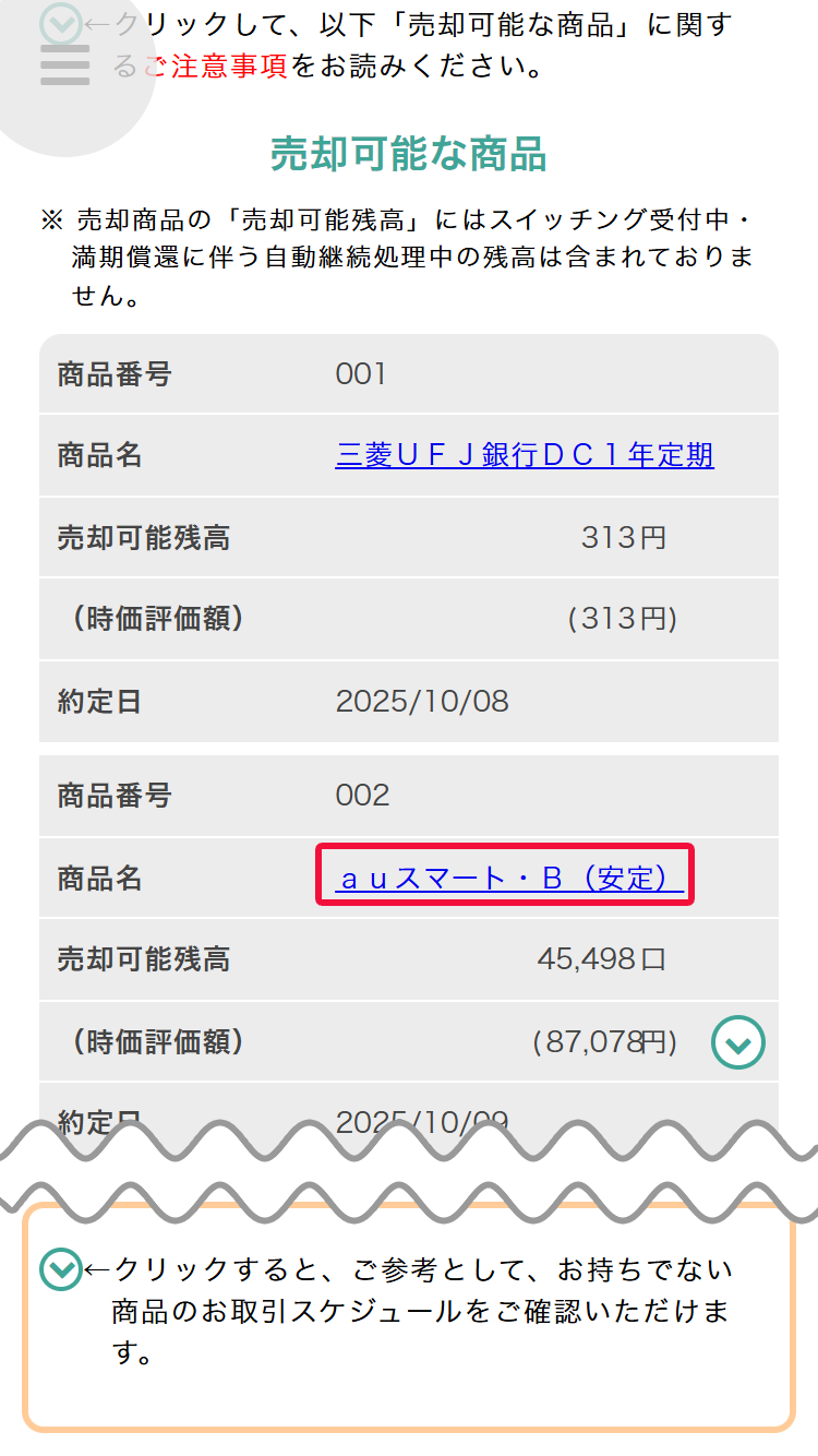 次に、売却する商品の[商品名]をクリックしてください。(複数指定不可)