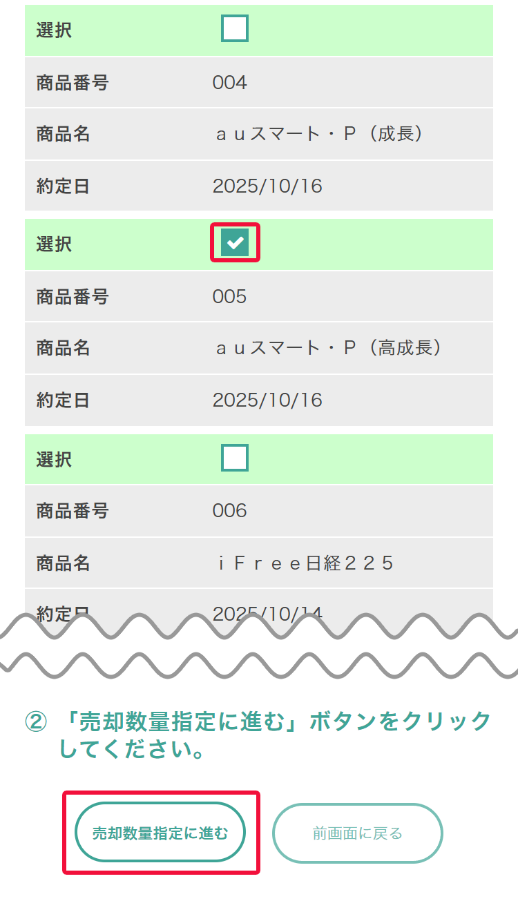 購入する商品を選択(複数指定可能)し、[売却数量指定に進む]ボタンを押してください。