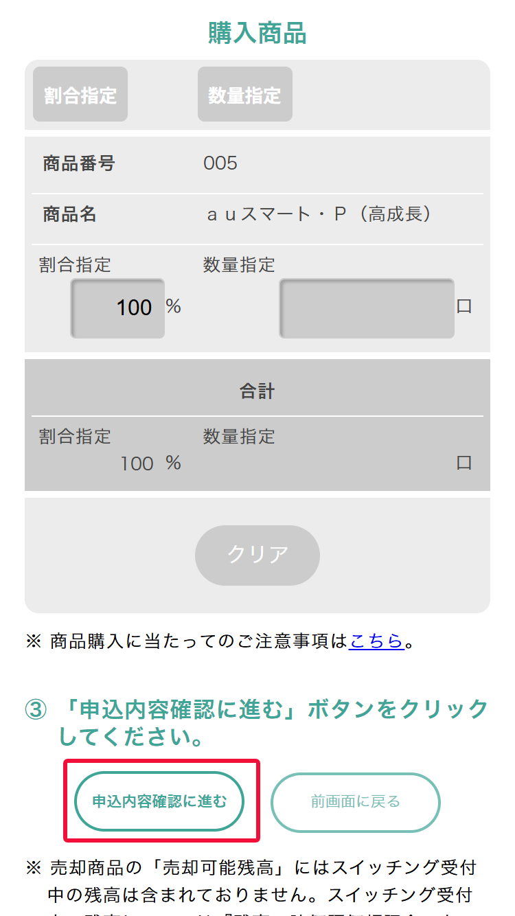 売却する商品の数量と購入商品の割合または数量を指定し、[申込内容に進む]ボタンを押してください。